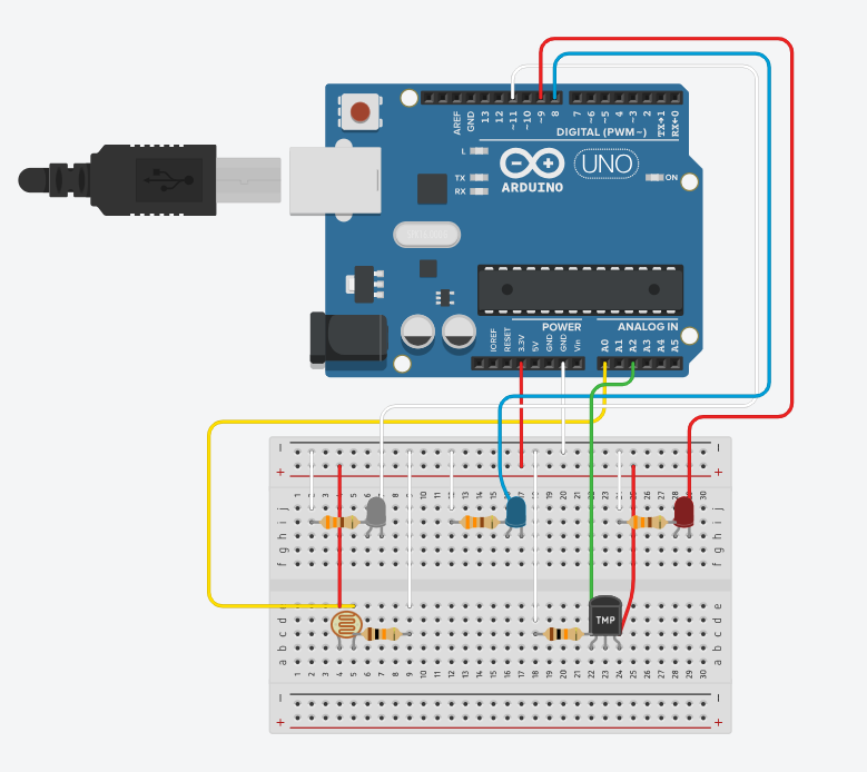 First of all, you can set some values of light and temperature that will be the limits to decide if an environment is dark or illuminated and cold or hot.