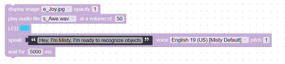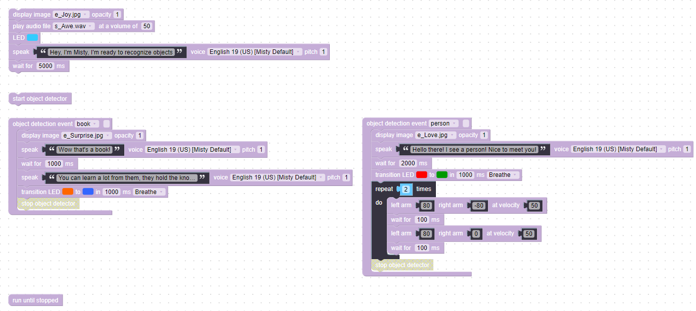The first challenge for your students after they finish the Blockly lesson course is to create an Object recognition event with Misty entering in a routine and then recognizing at least two objects. \