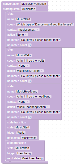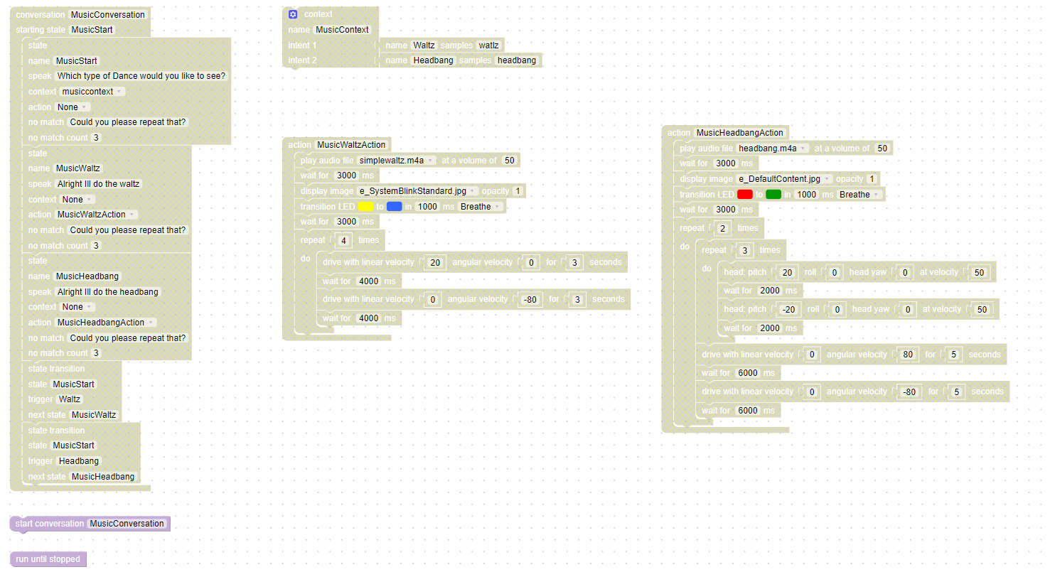 To make Misty learn which type of music/dance it's necessary to create a context that will train her AI capabilities to make her recognize the words in the sample label