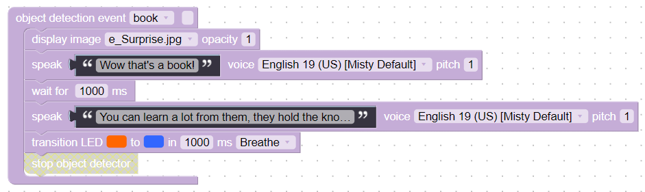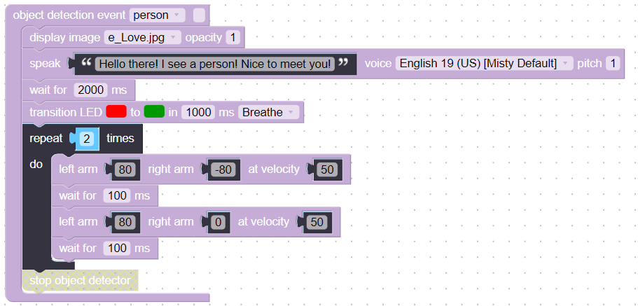 Make sure that your Misty will have a unique reaction to each recognized object and now you're ready to call the object recognition event: